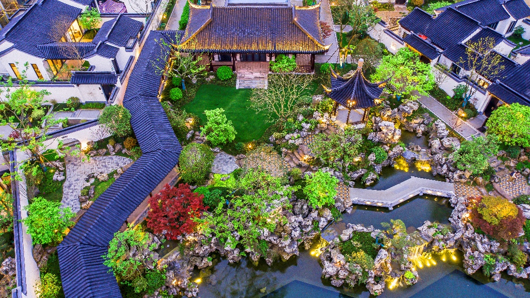 小桥流水,水榭亭台,曲廊幽径,中式院落……将人们带入进了陶渊明笔下的“桃花源”里。