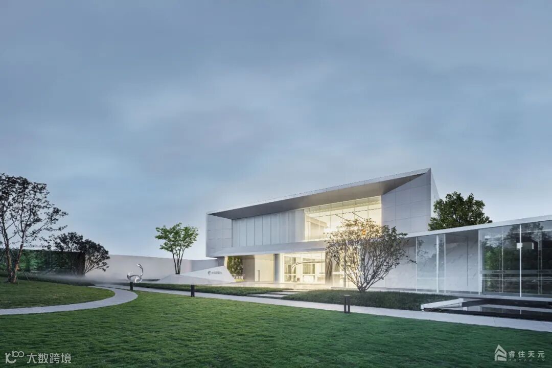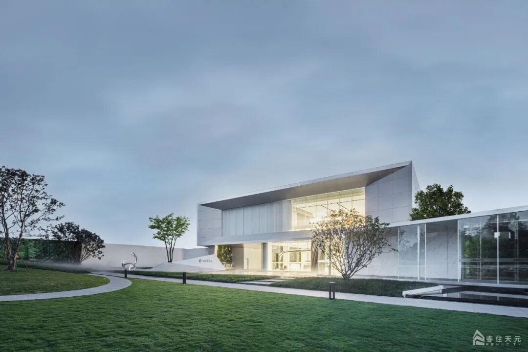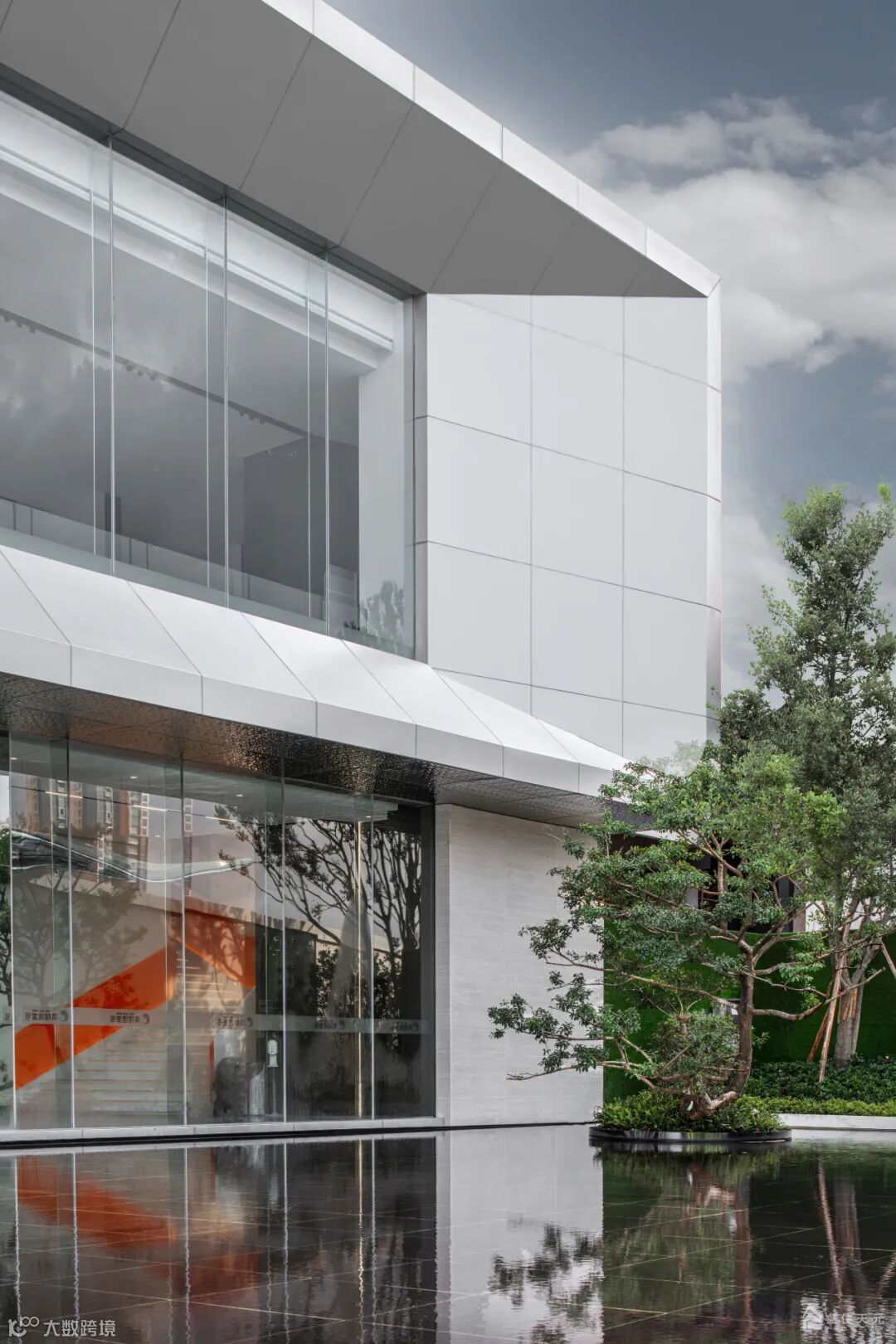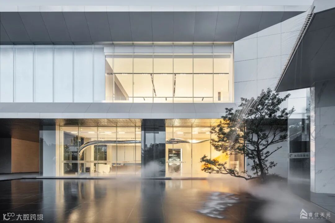 建筑主体采用了高透超白玻+折形白色铝板的双层立面设计,丰富了外立面的层次感。