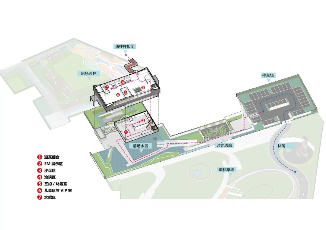 后场空间与地下室竖向设计相结合,同时覆土抬高1.5m,在售楼部二层依据高差优势俯瞰后场园林,美景尽收眼底,再通过楼梯去往一层,穿过半开敞的景观通廊到达样板间。