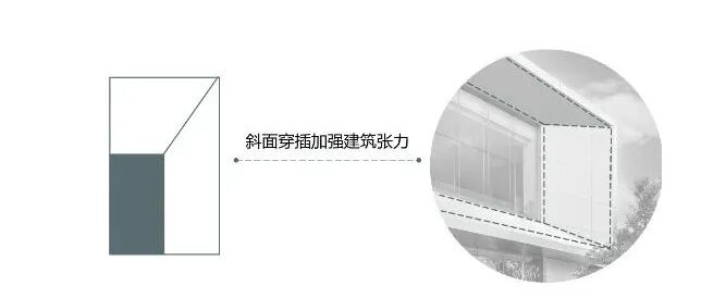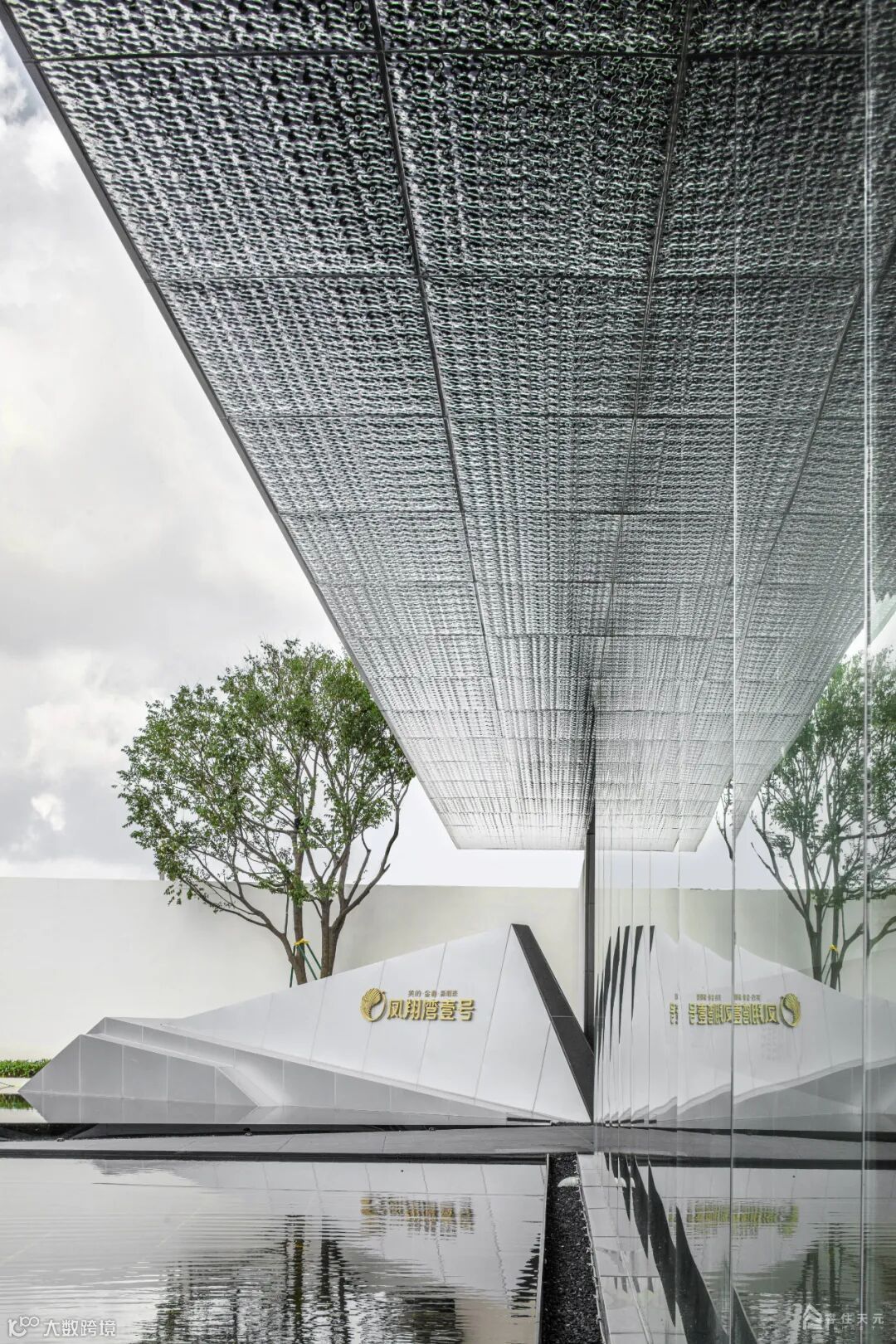羽毛抽象而来的斜面元素穿插其中,线条硬朗挺拔,富有节奏感与韵律感,体现了建筑简约的抽象美,增强了建筑的张力。