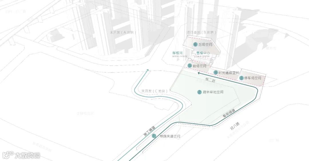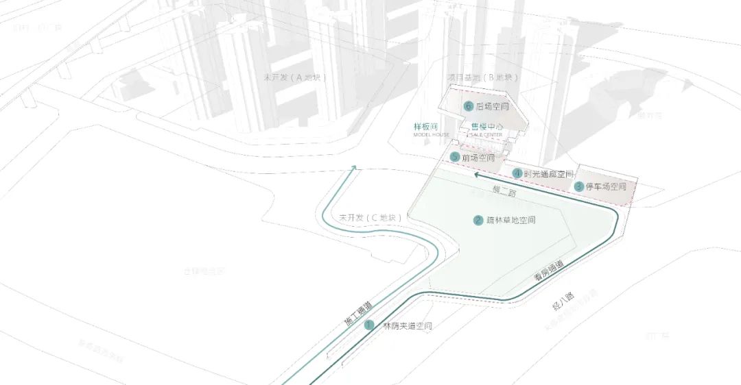 ◆ 通过看房通道结合两侧围挡与绿化形成林荫夹道空间;