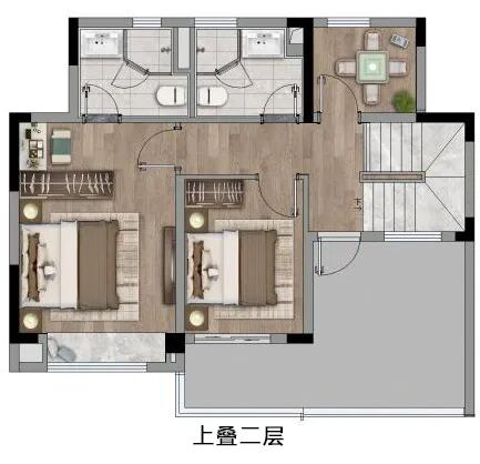 叠墅建筑面积约187㎡四室两厅三卫,约32㎡灵动空间,5米采光井,私家电梯直达,约4.35米瞰景阳台,客餐厅与卧室分楼层布局。