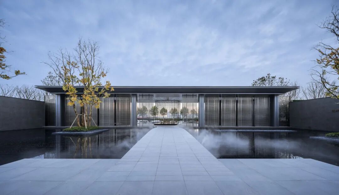 示范区的入口设计具有东方美学意蕴,以暗纹石材凸显质感,漏窗的设计则含蓄地呼应了富有深厚传统文化的南京地域特色,更以微妙的透绿将绿色愿景和光影变化纳入到达体验。