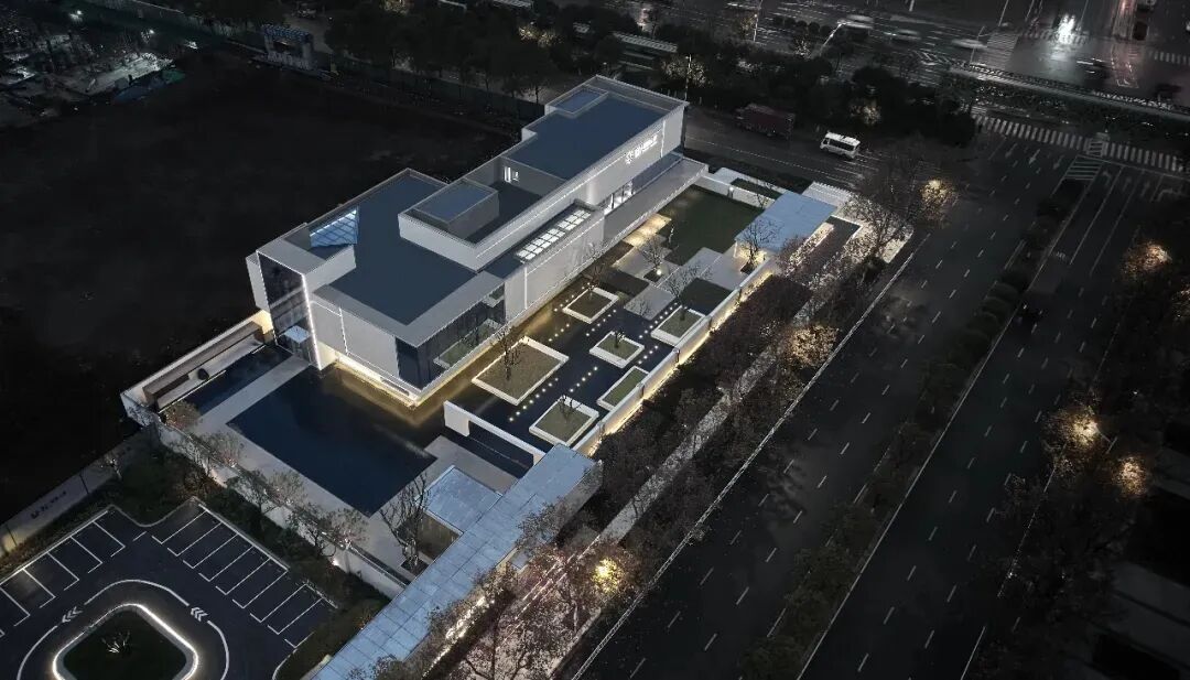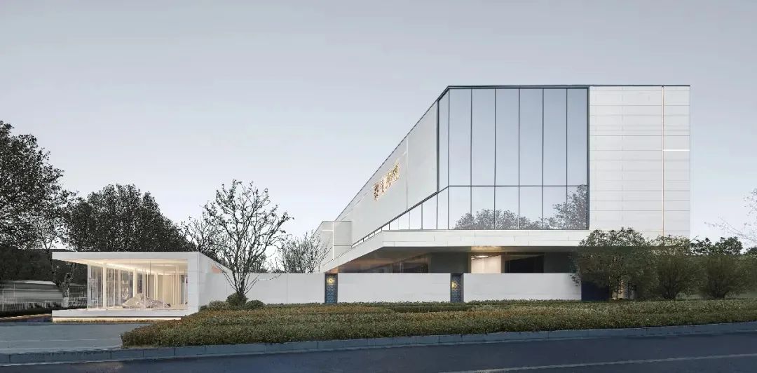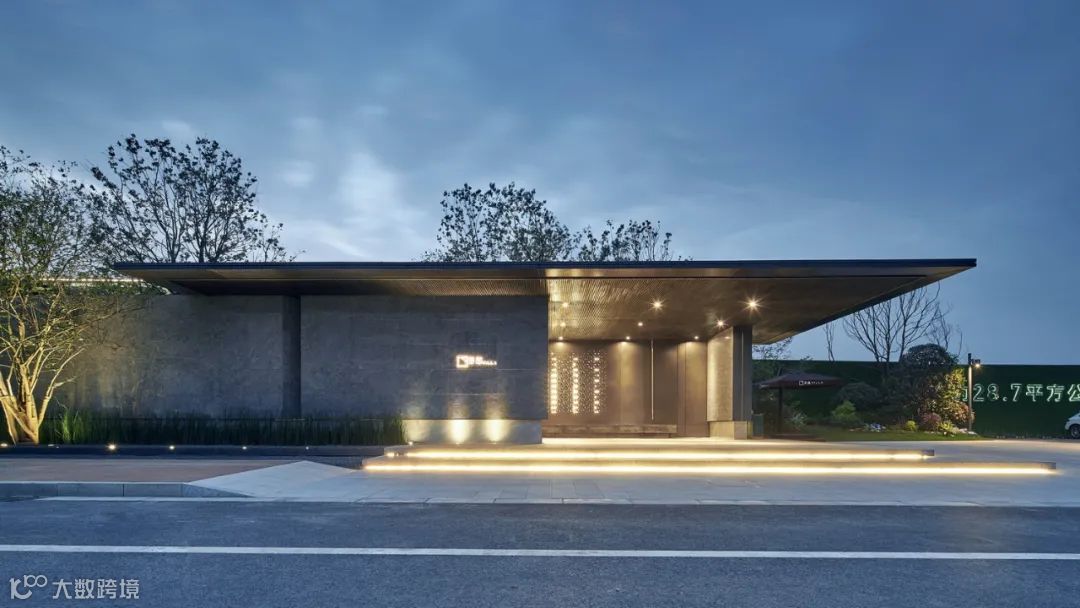 走近展示中心,设计以金属挑檐及景观墙体分别向两侧延展围合,呈现舒展且延续的水平线条,充分展示现代建筑的抽象与平衡感。