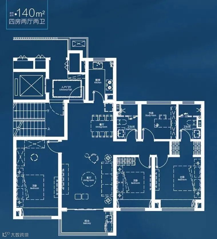 建筑面积约137㎡四房两厅两卫,南向四开间,双联阳台,全生命周期户型。