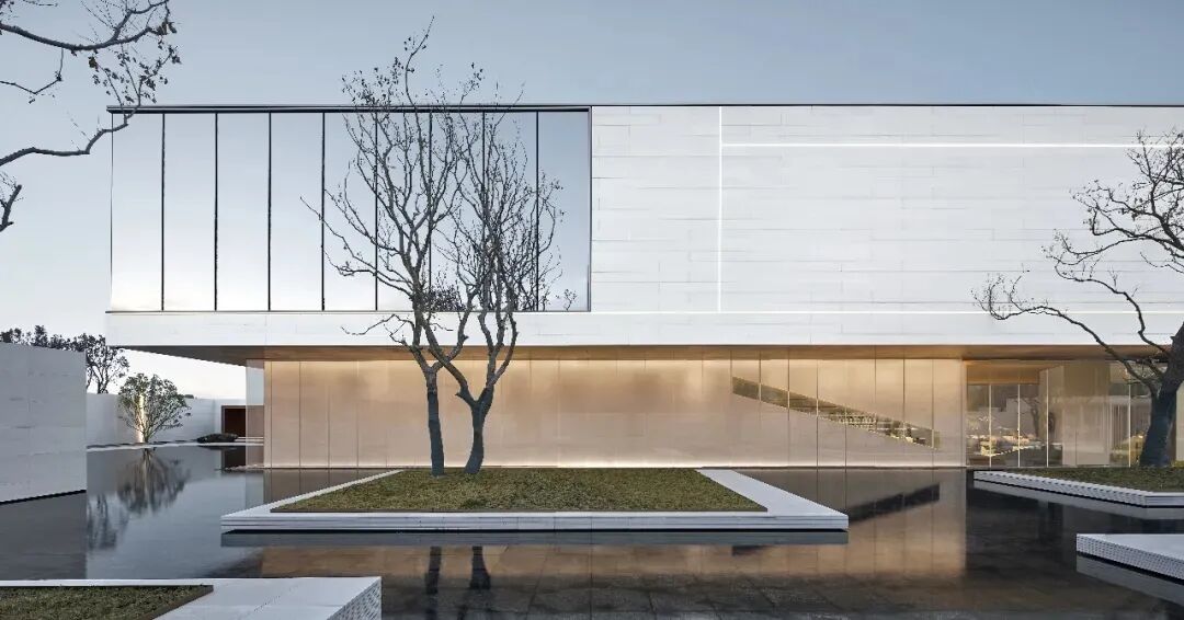 入口处水面平静,倒映着外立面柱体,视觉衍生出更多曲折感。石墙打造虚实相间的界面,上部金属质感材料碰撞出更加质感、均衡的空间体验。