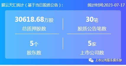 2023年7月17日,股票质押总质押股数30618.68万股,上市公司数5家,股质公告笔数30笔,股东数5个。