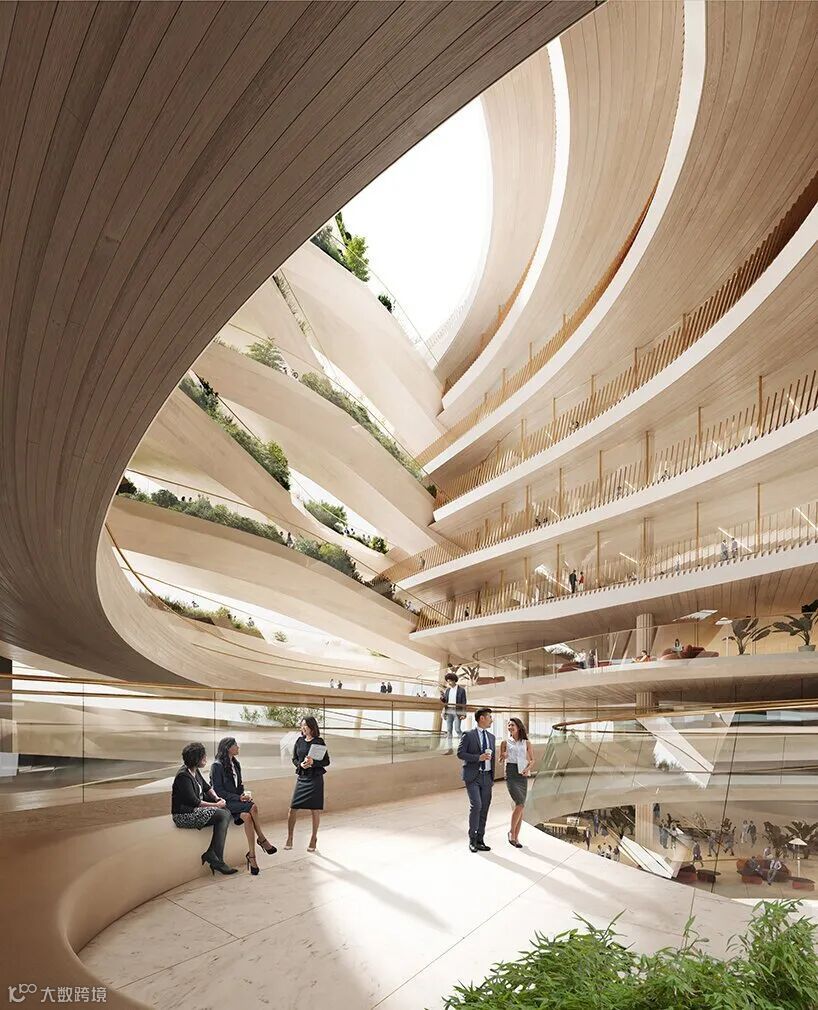 在这里,一个平静的绿洲延伸到新总部,员工可以与扩大社区互动。新总部不再是一个只有电梯才能到达的全封闭建筑,而是通过一系列的公园体验——包括植物、广场和雕塑地形——来激发建筑中的活力,以“之”字形的模式贯穿整个建筑,规划的露台和兴趣点鼓励人们在旅途中暂停和放慢脚步。