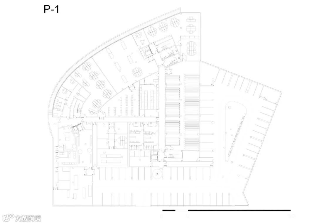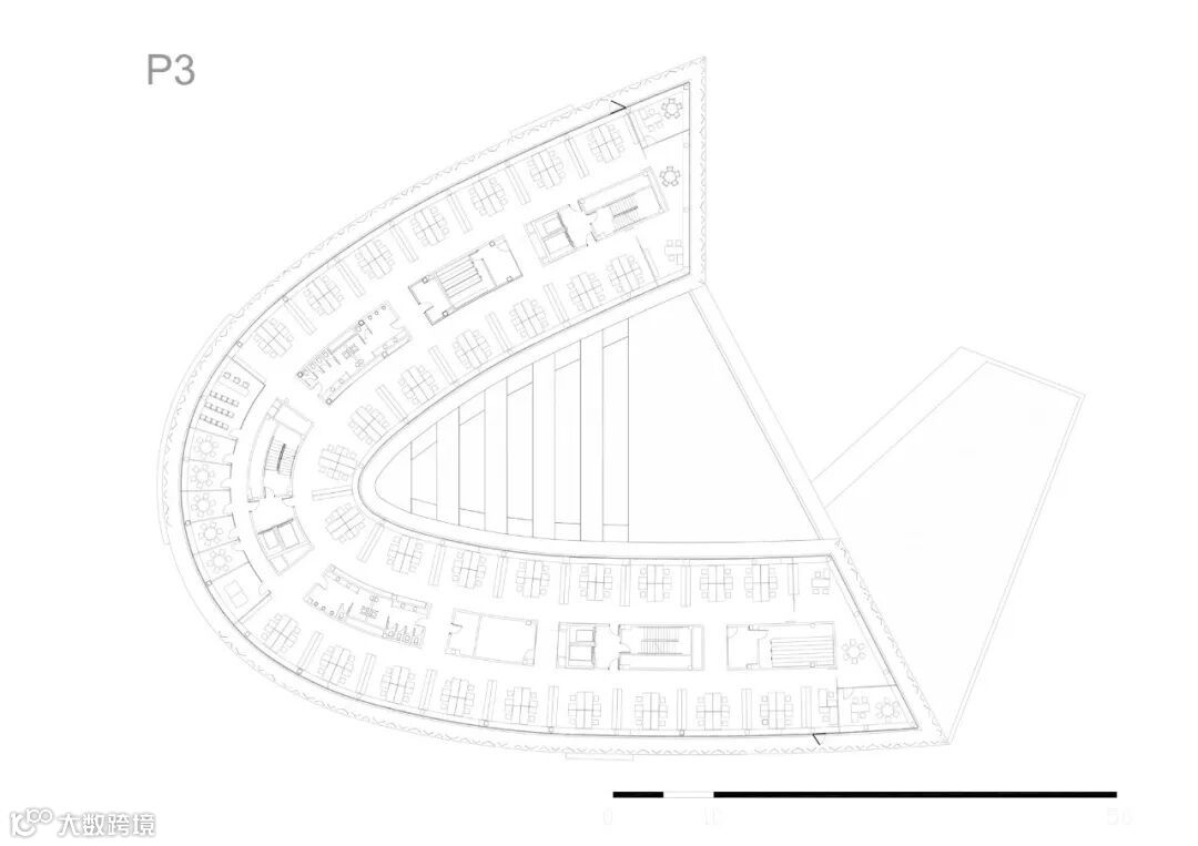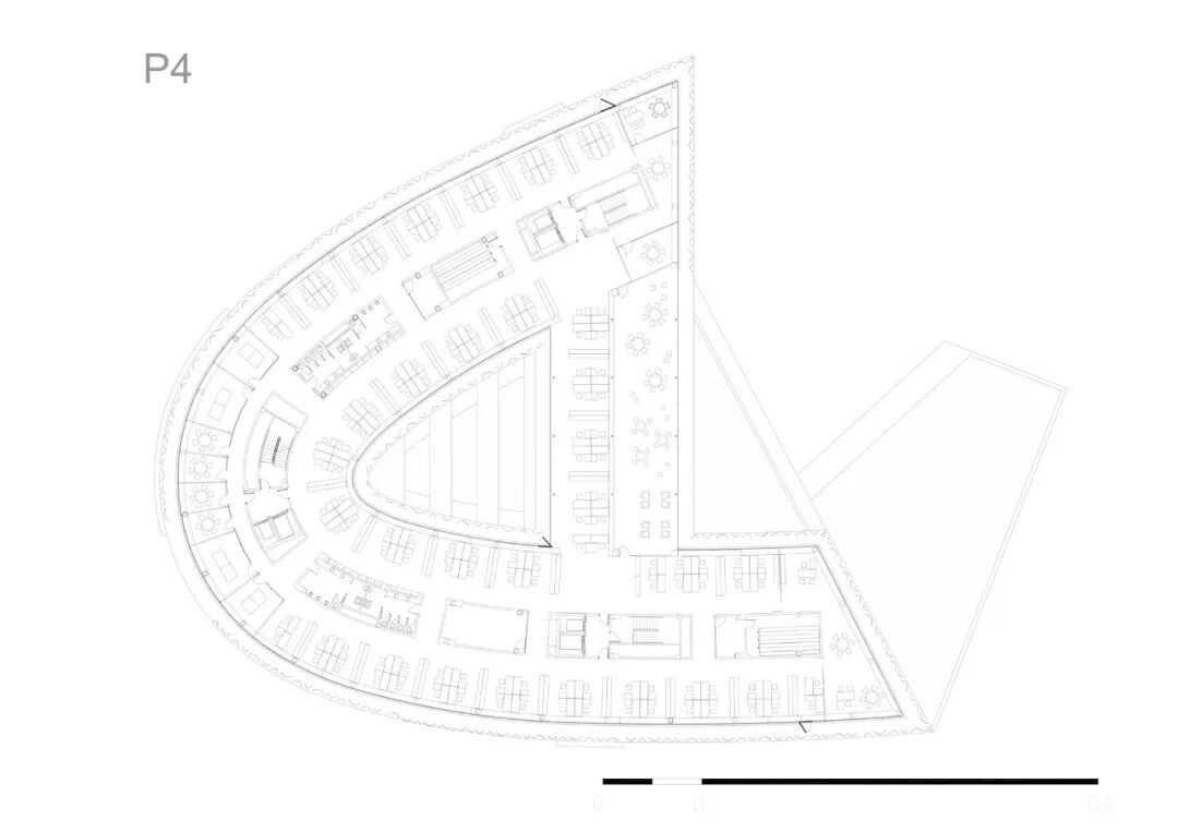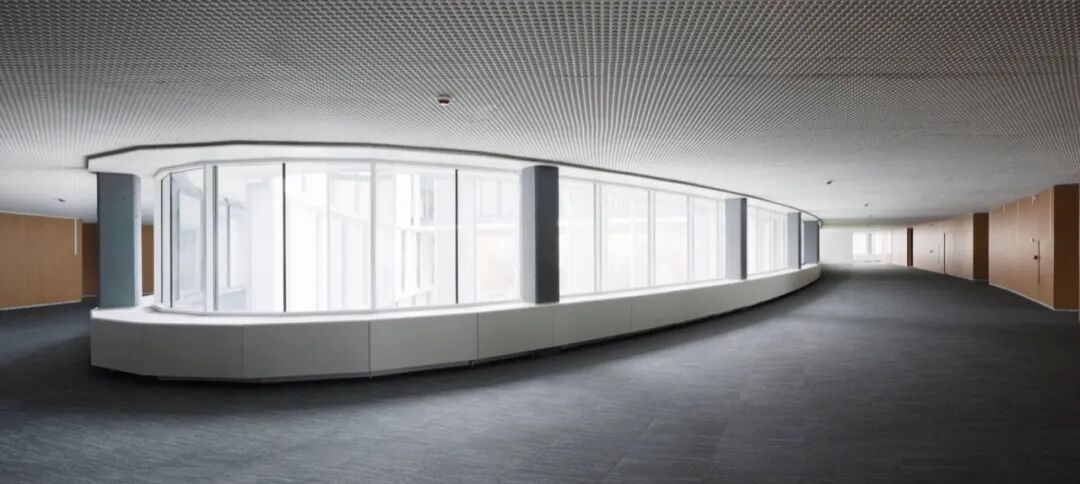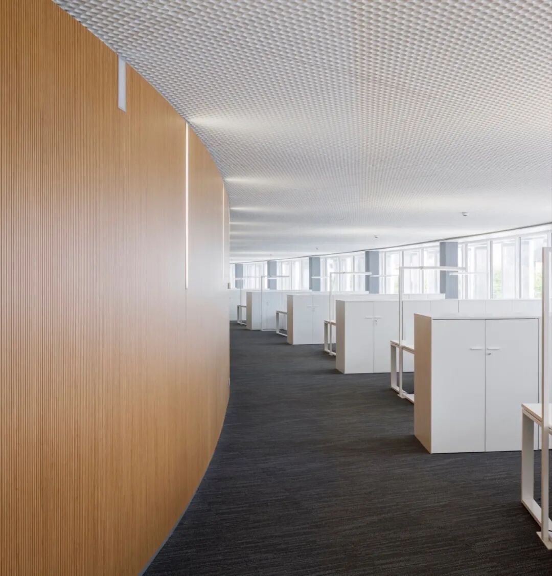 每一层都由一个纵向空间产生,通过三个等距的核心与建筑的其他部分垂直相通。这个空间根据不同的部门布局进行规划,主要被设想为一个景观办公室,所有的工作站都与外墙长窗口相关联。