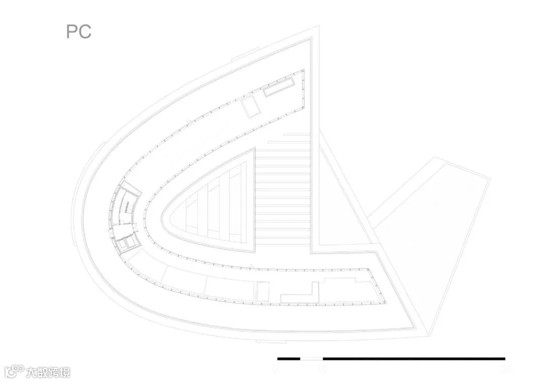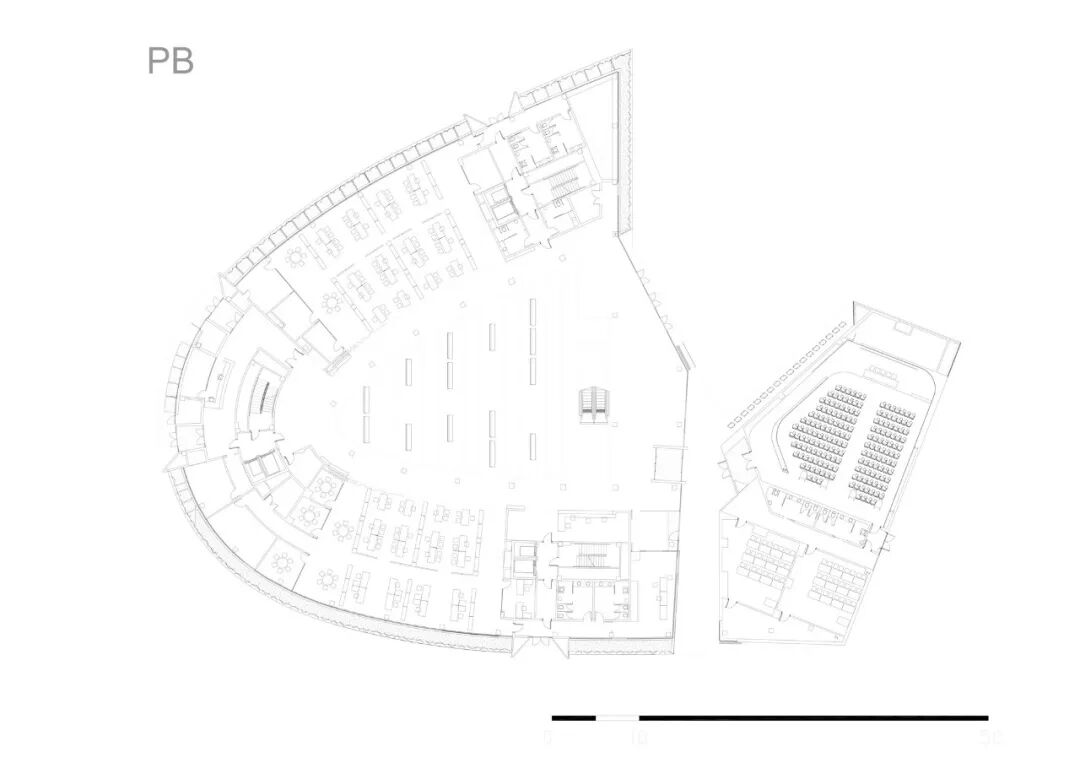 在北立面,建筑有一个明显的曲线,产生一个连续和平滑的体量,它面对城市的正交布局,将自己与它分离,并声称它的制度特征。朝南,连续性被更复杂的体量打断,这些体量产生了公众的主入口,同时寻求与新的圣马丁广场的连接。