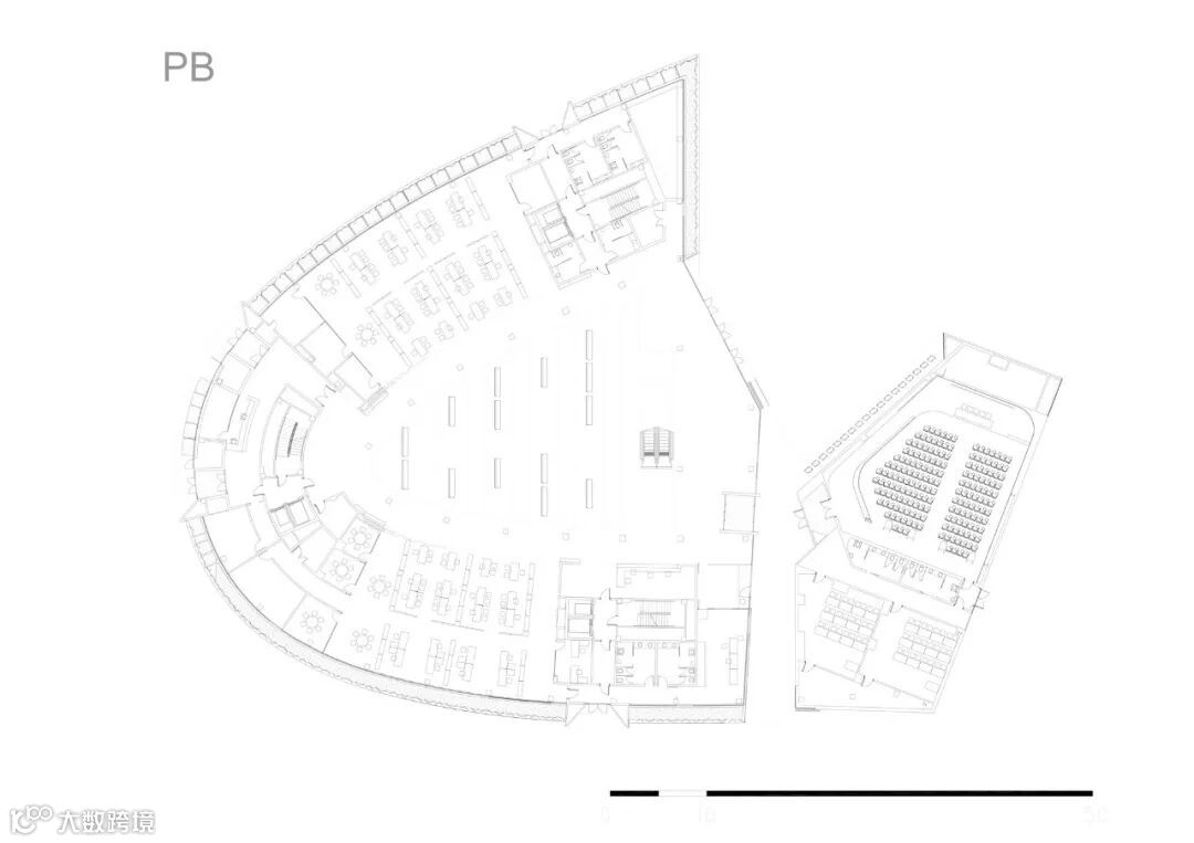 在垂直核心之间,它们就像一个主干,服务区域位于:厕所、档案和技术室。一个单层的附加建筑也产生了,朝向南面。它包含了培训室和一个会议厅,可以从外面进入。