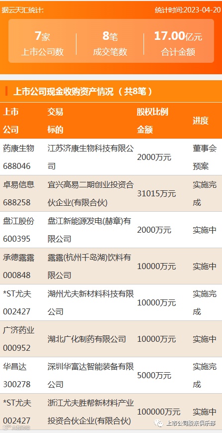 2023年4月20日,资产交易成交金额17亿元,上市公司7家,成交8笔,上市公司现金收购资产8笔。