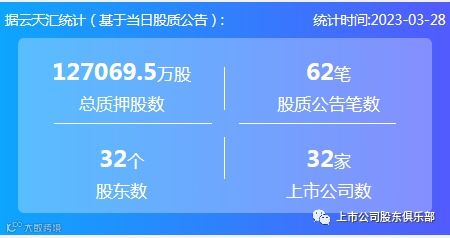 2023年3月28日,股票质押总质押股数127069.5万股,上市公司数32家,股质公告笔数62笔,股东数32个。
