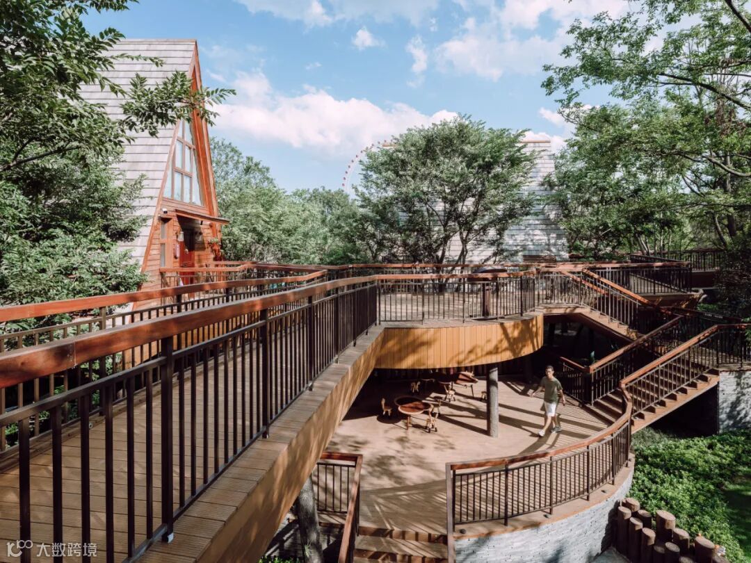 同时还有观景休闲空间,让人们可以在树梢之间观赏,休憩。栈桥和树屋的架空,让地面层最大限度的让了出来,减少了对周边的影响,也获得了一个自由的全景花园。在周边建筑和树木的遮挡下,夏季也阴凉舒适。