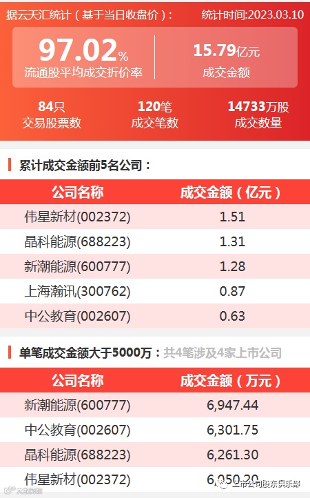 2023年3月10日,大宗交易成交金额15.79亿元,交易股票数84只,成交笔数120笔,流通股平均成交折价率97.02%,成交数量14733万股。