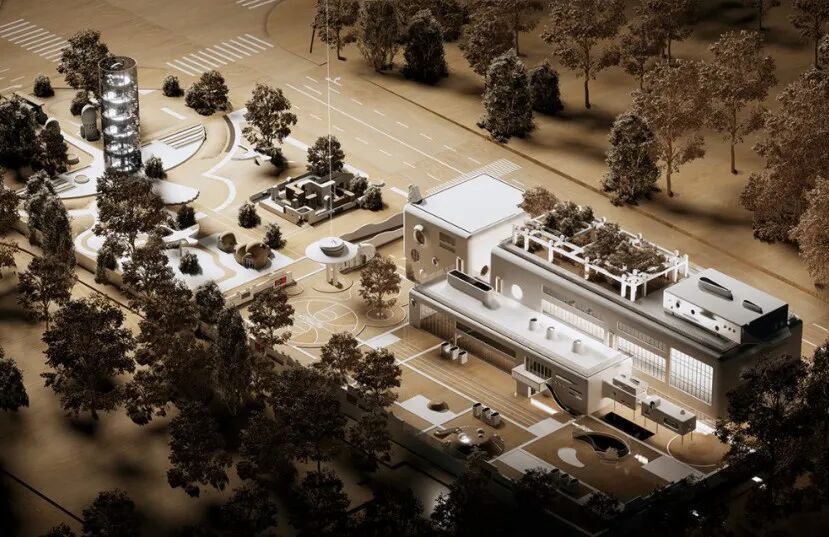 主体教学楼的整体形态呈现出从封闭世界到无限宇宙的畅想。宇宙飞船的意向造型像从四面八方趋向空间中央,也像存在于无限之中,可以不受限定地前往新的世界。我们从点到面,以此延伸出刚柔并济的、具有抽象感与体量感的建筑形象。