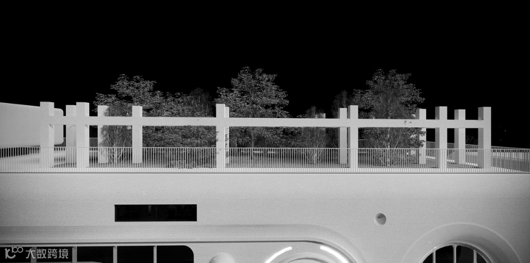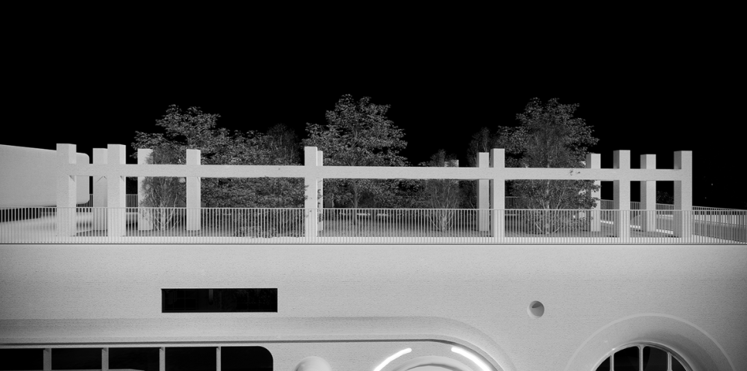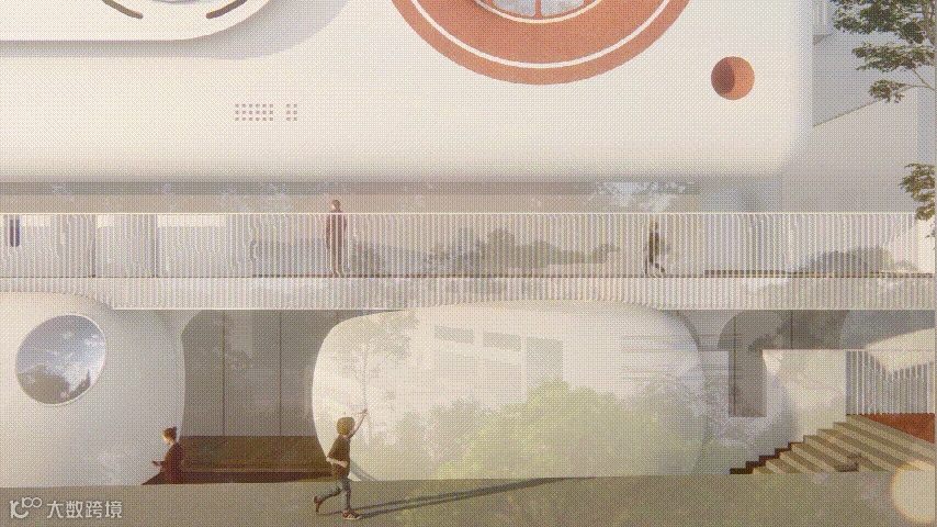 「泡泡」的概念不仅体现在小体量的游戏屋,而是渗透于整个项目的建筑设计之中,不论是弧形的墙体线条,还是立面上大小各异的「平面泡泡」,都希望通过整体输出,打造一个充满互动的童趣空间。