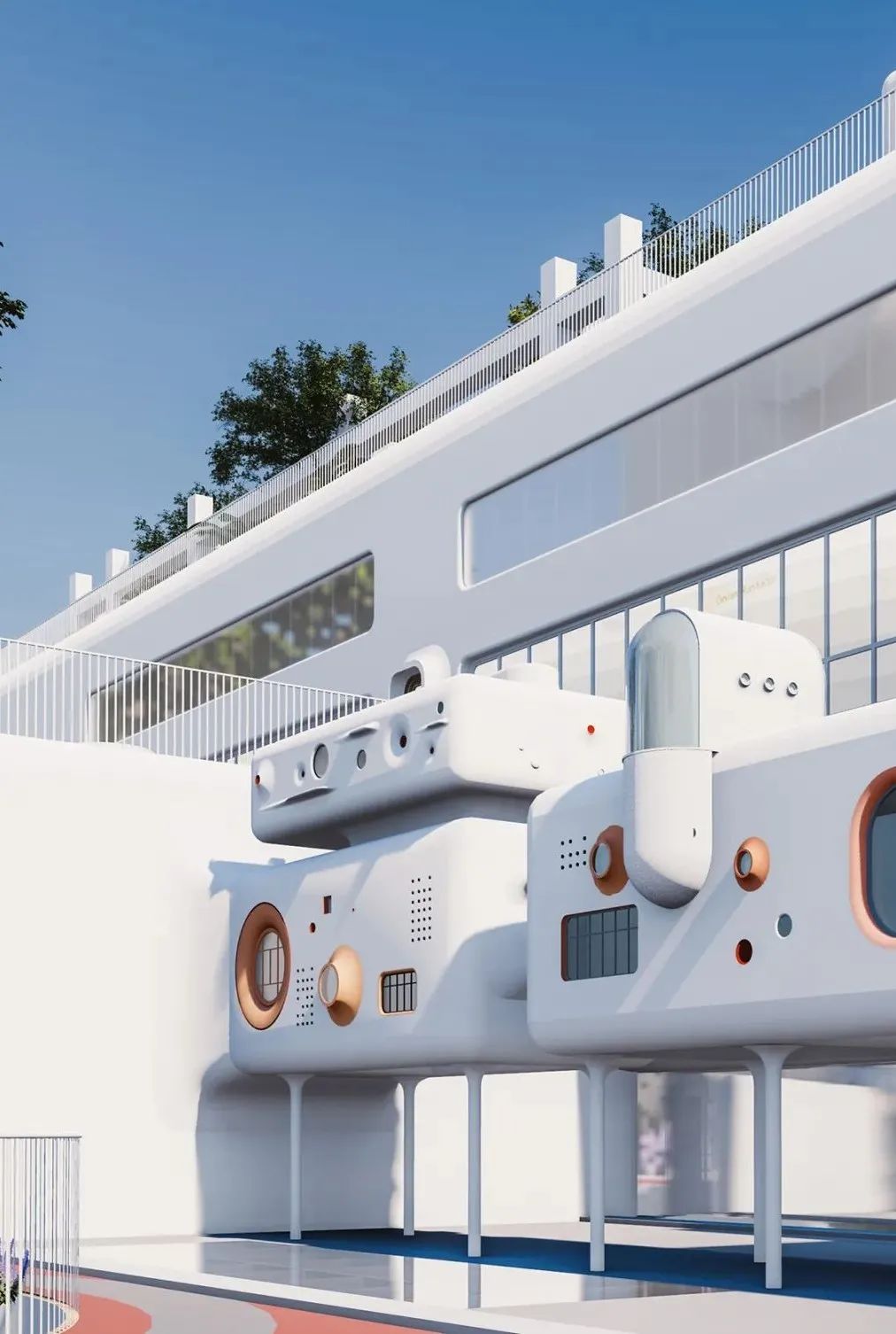 各个立面将孩子的奇思妙想进一步发散、延伸。北侧立面作为主入口区,「飞船」造型一览无余,南侧立面承载大面积的落地窗。
