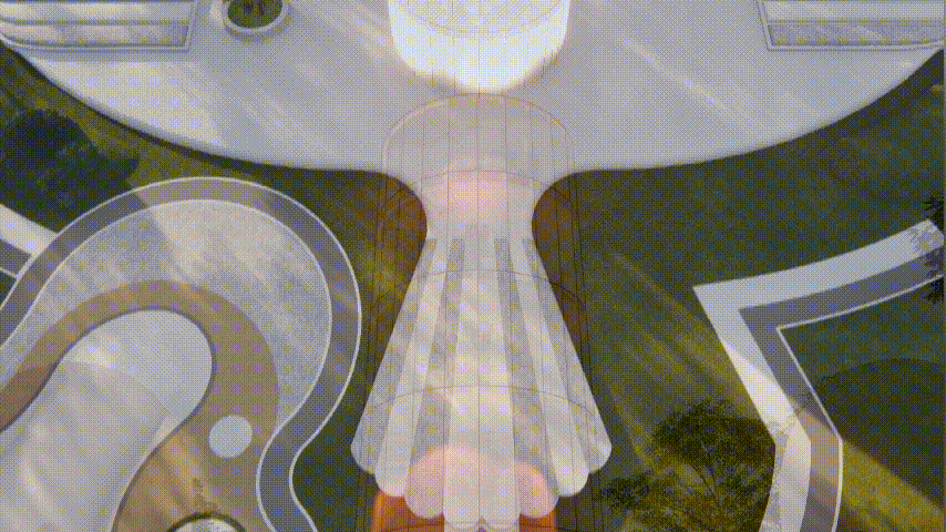 迪卡将项目从功能上划分成三大区域,以雁群造型为主的公共空间(市政广场),承载飞舱和泡泡屋的教学主体,以及「飞碟」与各类活动场地所在的景观区。