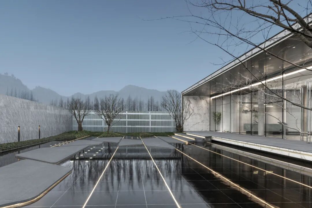 庭院围绕着 “ 水上云汀 ” 的意向进行了现代美学的融合与抽象,给予使用者宛如游览于山林之间般的庭院体验。