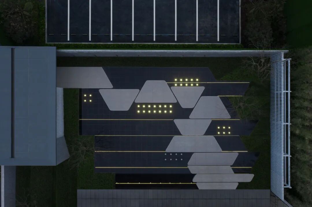 建筑以一种适应性的方式嵌入场地,通过极简的几何形态回应场地边界,同时将建筑从场地上微微抬起,底部引入静水面,建筑体块空间上形成上升的态势,营造出建筑的漂浮感。再通过切挖、凸变等手法增加呼吸与通透感,构建内部的庭院空间。最终演化成一座漂浮于水面、与场地共生的“水晶匣子”。