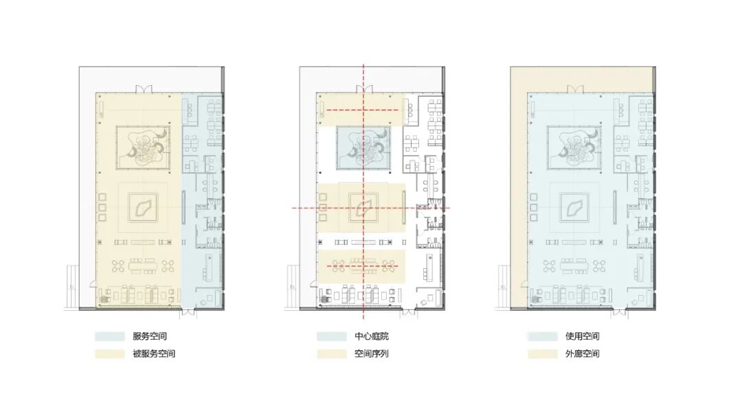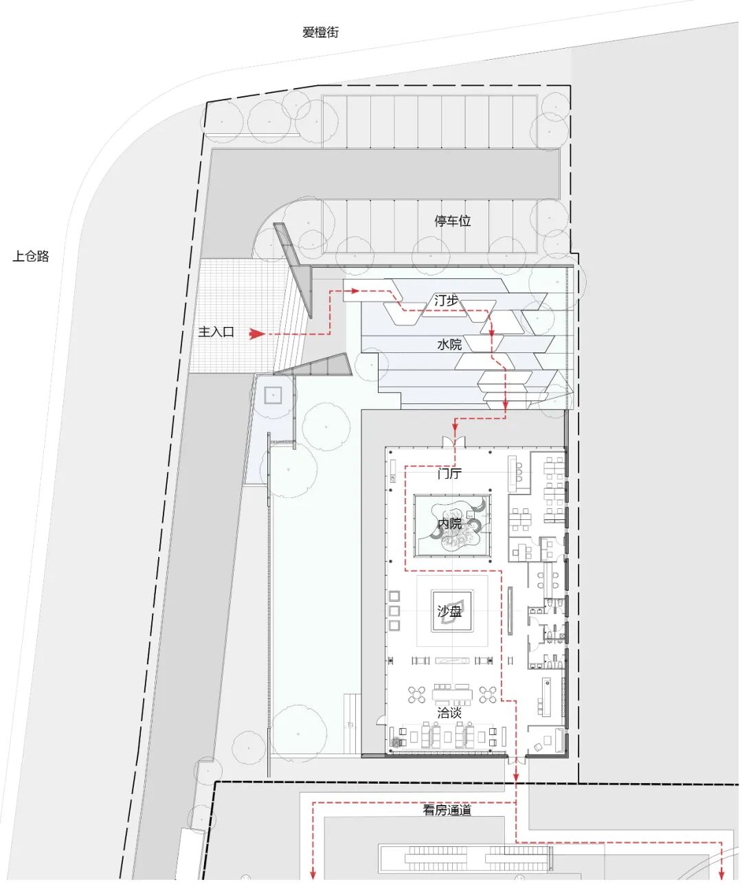 主入口位于建筑的西北侧,北侧与西侧形体内退,形成连廊;连廊连接门厅,通往内庭院。
