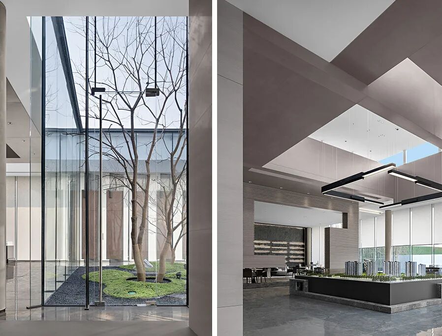 庭院串联起前场接待空间和内部展示空间,实现人、建筑、自然三者之间的交互。在建筑与自然的对话中,沙盘展示区映入眼帘,展示区上方凸起的天窗,将自然光引入室内,提亮沙盘区域,强调示范区的核心功能。