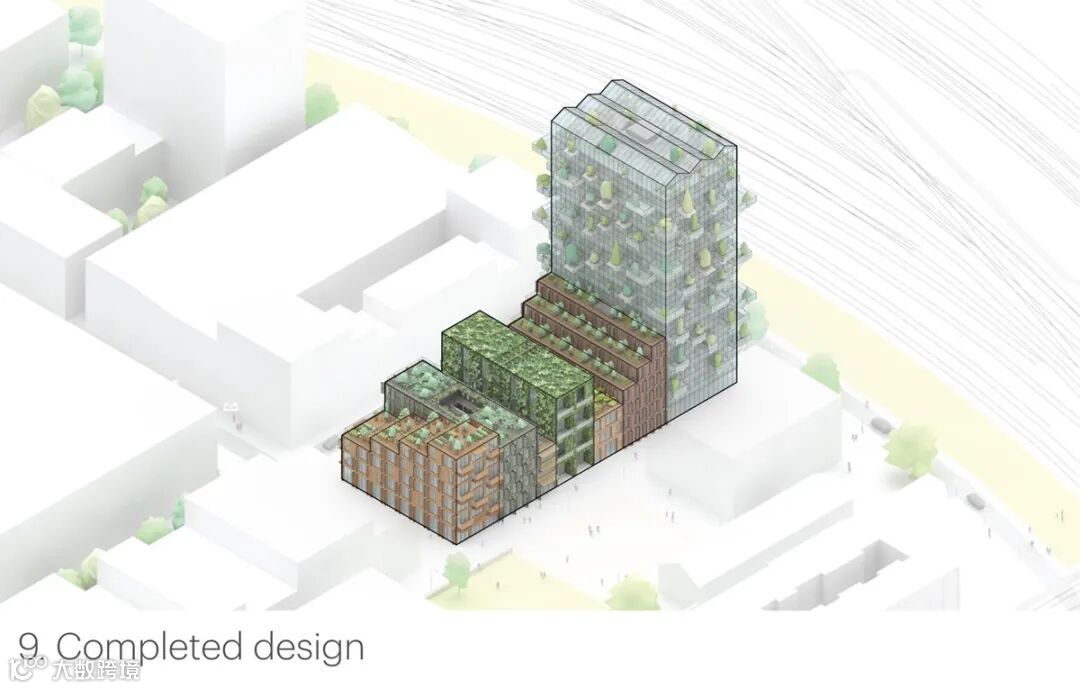 MVRDV的七个“de oosterlingen”建筑组成了一个绿色实验室,或绿色博览会。建筑是阶梯式的,从最低的建筑到塔楼的一端有阳台。