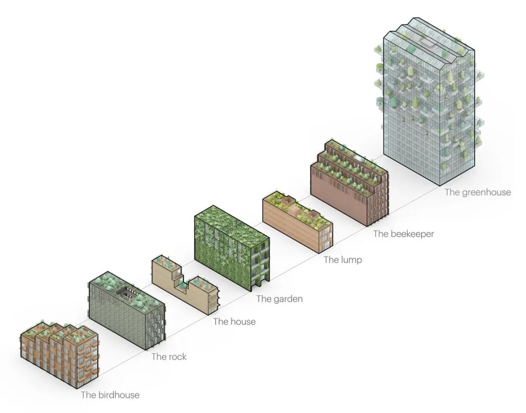 MVRDV的团队设计了七个相邻的建筑,每个建筑都有自己的生活方式,围绕着一个集体空间和屋顶,并为城市绿化做出了自己的贡献。一端是“温室”,然后依次是“养蜂人”、“土块”、“花园”、“房子”、“岩石”和“鸟屋”。