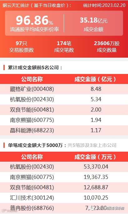 2023年2月20日,大宗交易成交金额35.18亿元,交易股票数97只,成交笔数174笔,流通股平均成交折价率96.86%,成交数量23606万股。