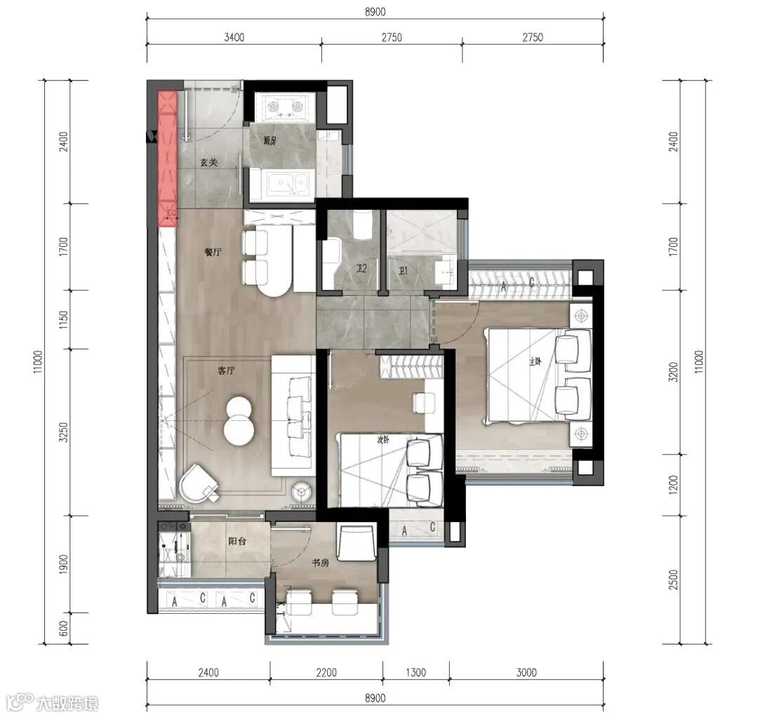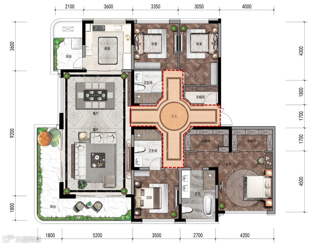 豪宅户型的玄关还得起到优化入户动线、动静分区,主客互不相扰、保护隐私的作用。