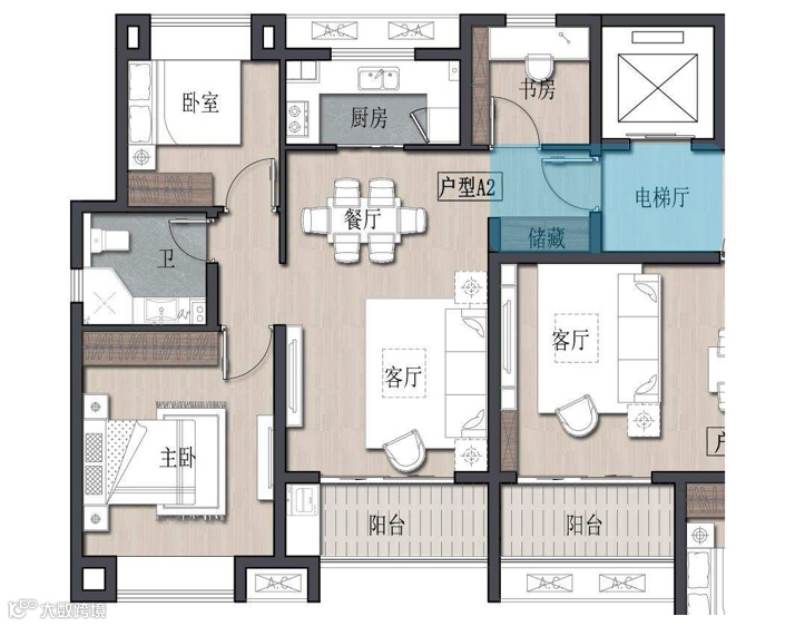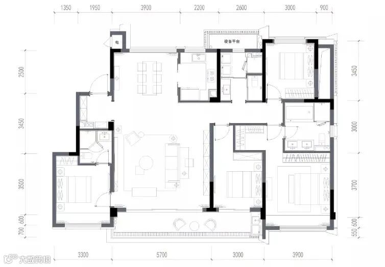 这个95㎡的小户型,南向三开间,贯通式的大阳台,开间5.6m。