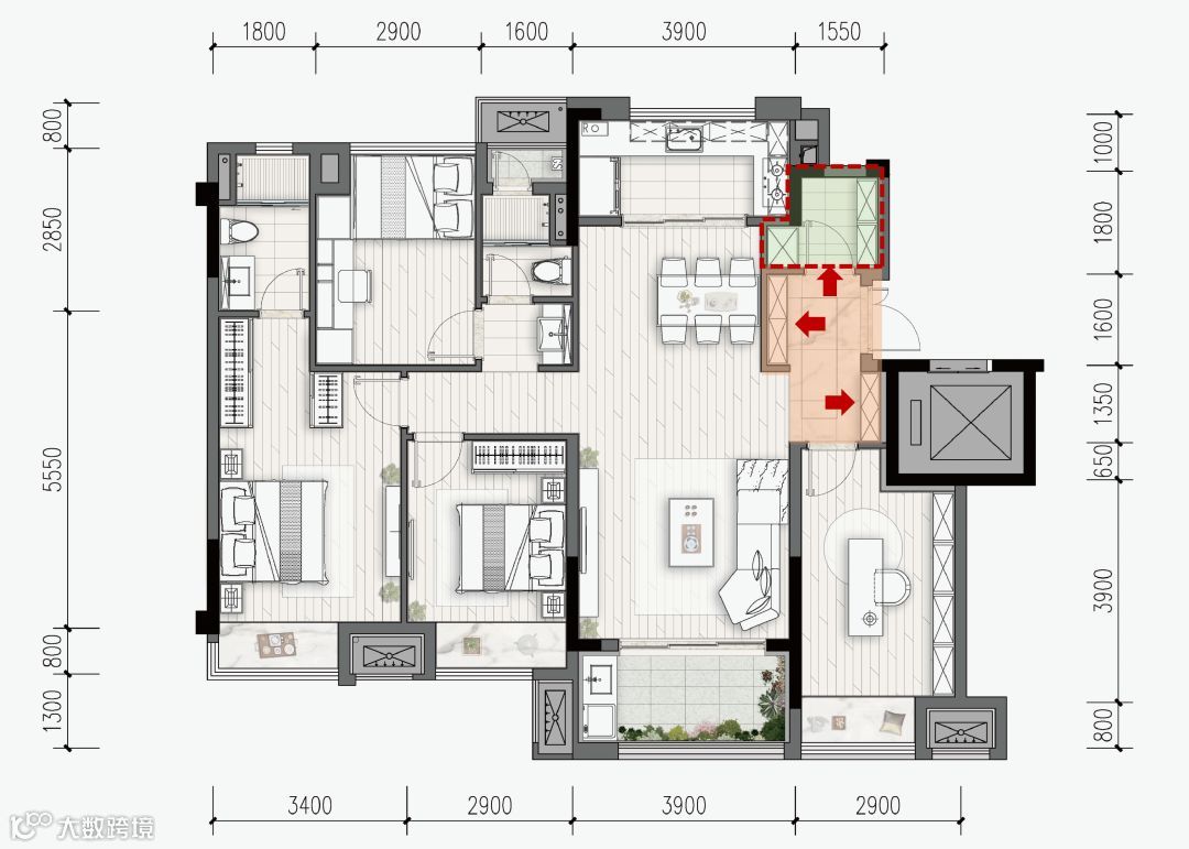 东原·印未央约168 m²户型是独立电梯入户,内外双玄关,并且连接一个家政阳台,十分方便。