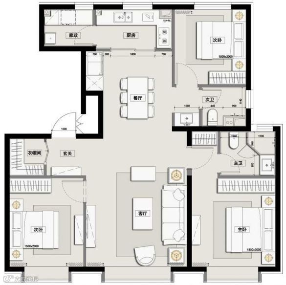 比如金茂悦系120平户型中,入户玄关处连着一个衣帽间,主人回家随手脱下来的大衣、帽子、鞋,都可以放在这里,具备超强收纳功能,也能令女主人一见倾心。