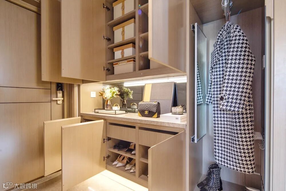 玄关空间不那么大的户型可以在玄关处设置一套具备成长性的多功能玄关,空间足够大的甚至可以在玄关处开辟一个储物间或者一个衣帽间,充分实现收纳。