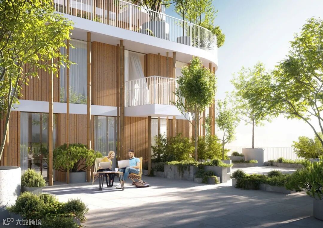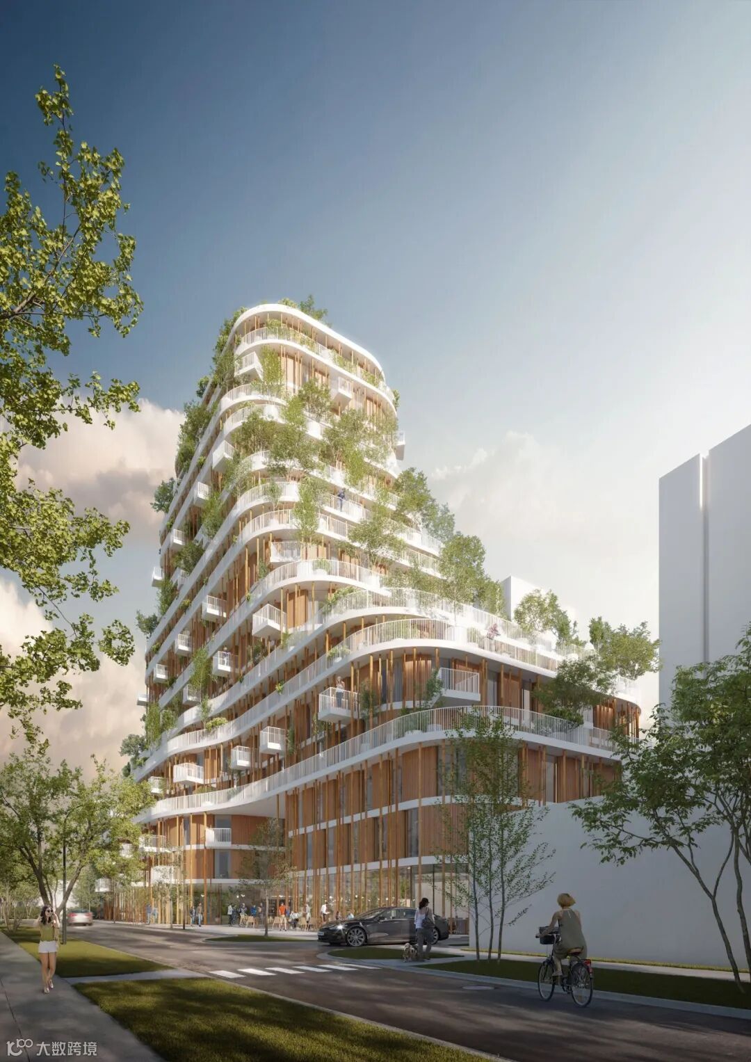 这使公寓沐浴在阳光下。在形式上,每层楼的角落都是弯曲的,以软化建筑的外观。沿着立面,结构设想为有树叶、树木和植物,以及生长在露台上的绿色植物。