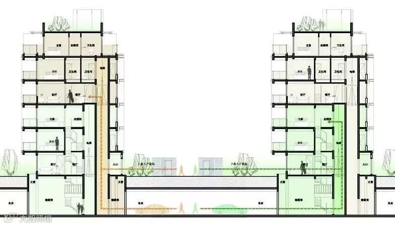 曾经叠墅被诟病是伪别墅,其中一个原因是入户私密性和仪式感做得不到位,更糟心的是,早期很多叠墅没有设电梯,业主每天要从地库爬楼回家,居住体验极差。