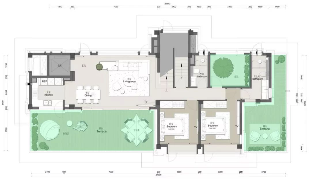 空间布局打破了传统叠拼的构造,设计出“2+2+庭院”的结构,在相对有独立空间的基础上,私密又和谐互动。