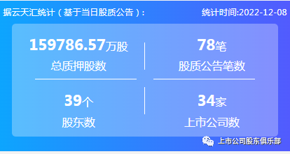 2022年12月08日,股票质押总质押股数159786.57万股,上市公司数34家,股质公告笔数78笔,股东数39个。