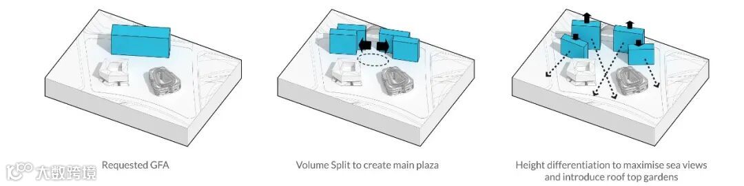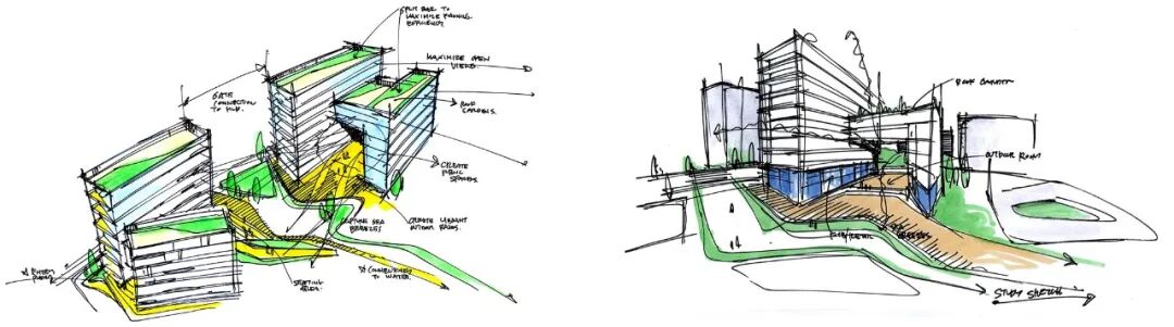项目主体部分由一组容纳常规办公空间的建筑体量、一组具备酒店式小产权办公的建筑体量以及各自的底层配套商业构成。设计以融合自然景观与营造公共空间为核心构思理念,通过对常规阵列式建筑排布的突破以及对传统中心式平面布局的解构,对建筑体量进行合理的拆分与错动,在最大化利用海景视野的同时,形成一系列庭院、广场及有遮蔽的室外空间,进而作为功能性活动场地、餐饮外摆平台、社区休闲公园等功能,服务于项目客户及城市居民。独特的分布式核心配置保证了不同类型办公单元所需的充足采光、自然通风与社区互动空间。