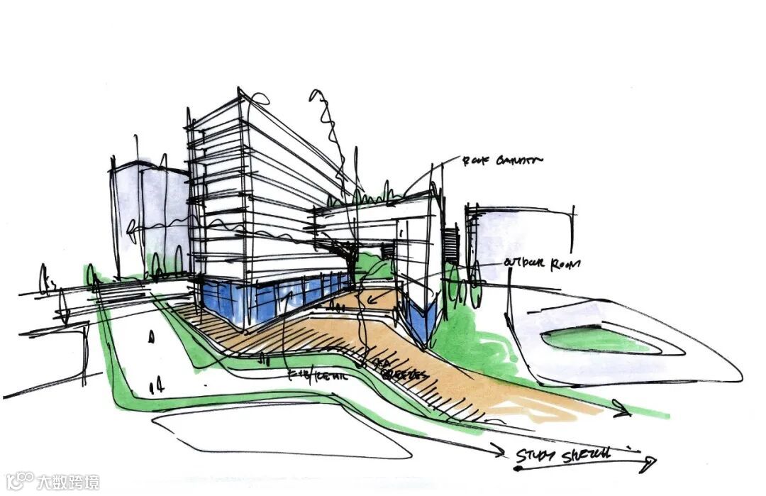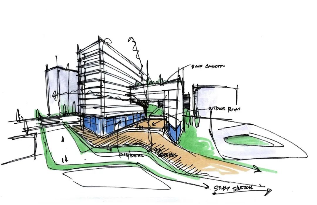 同时,为了体现初创企业的新生与活力,设计在水元素柔美荡漾姿态的基调上,融合了富于科技动感、简洁而挺拔的流线型元素,借助材料处理与穿插变化形成丰富的构图层次,进而体现了建筑作为一种媒介在瞬息万变的城市发展与自然环境之间不断寻求和谐的过程。