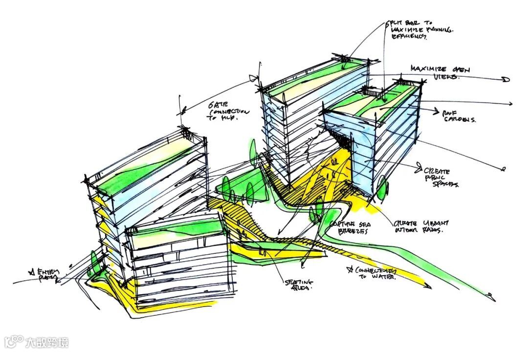 为避免形成拥挤的城市形象和消极的室外空间,项目在总图布局中注重空层次的塑造与对景呼应,一方面强化建筑与片区规划中景观轴线与视觉通廊的联系,另一方面通过设计大量的公共开敞绿地及屋顶花园,在场地内创造多样化的景观形态。”