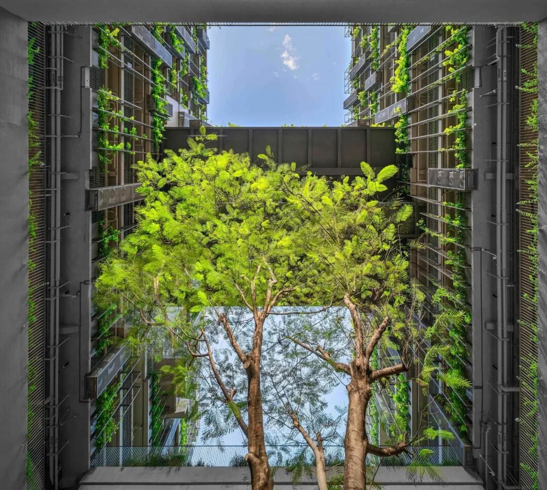 另外,绿植的设计形成了教学空间与外部城市之间的天然屏障,使每一间教室都在植物的萦绕下形成更安静、私密的教学氛围。校园中绿植乔木形成的遮蔽不仅丰富了空间层次,同时起到降温隔热的作用。密集的垂直绿化使得个体在自然中找到庇护感,同时这种庇护又形成了一种有效的气候应对策略。
