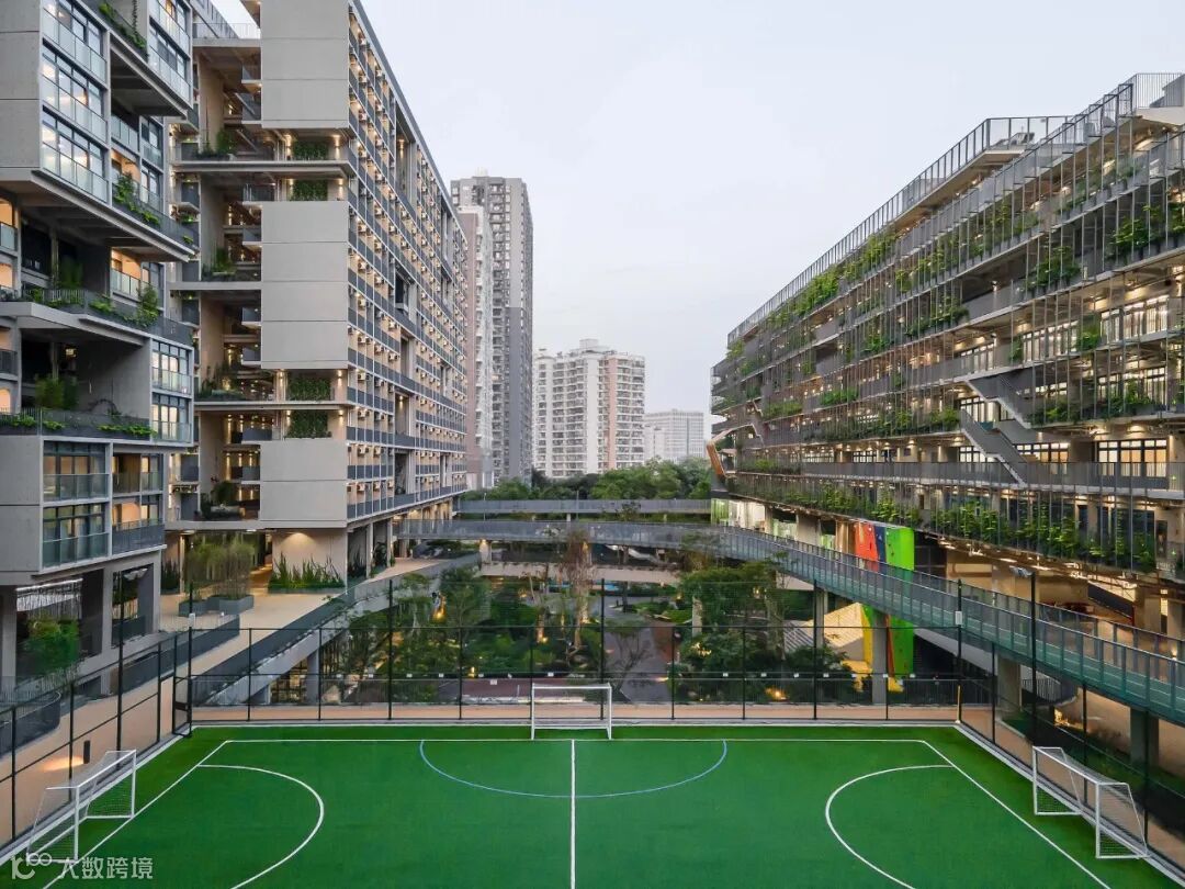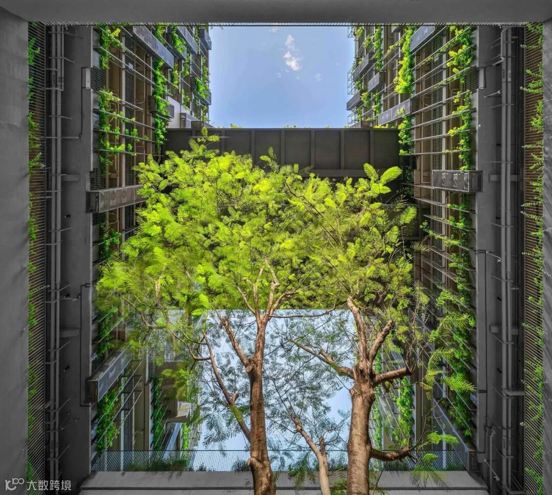 另一方面,建筑主体的教学楼、学生宿舍与教室宿舍三座塔楼都在不同层穿插布置2-4层通过的空中庭院,形成气孔,引导通风。这些空间的留白与植物和水景的设计结合在一起,成为可以驻足停留的户外公共空间。高密度空间的呼吸的管道,不仅回应了深圳的气候特征,也为生活在高密度空间中的日常生活创造了可以喘息的空间。