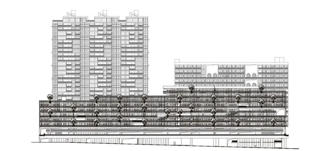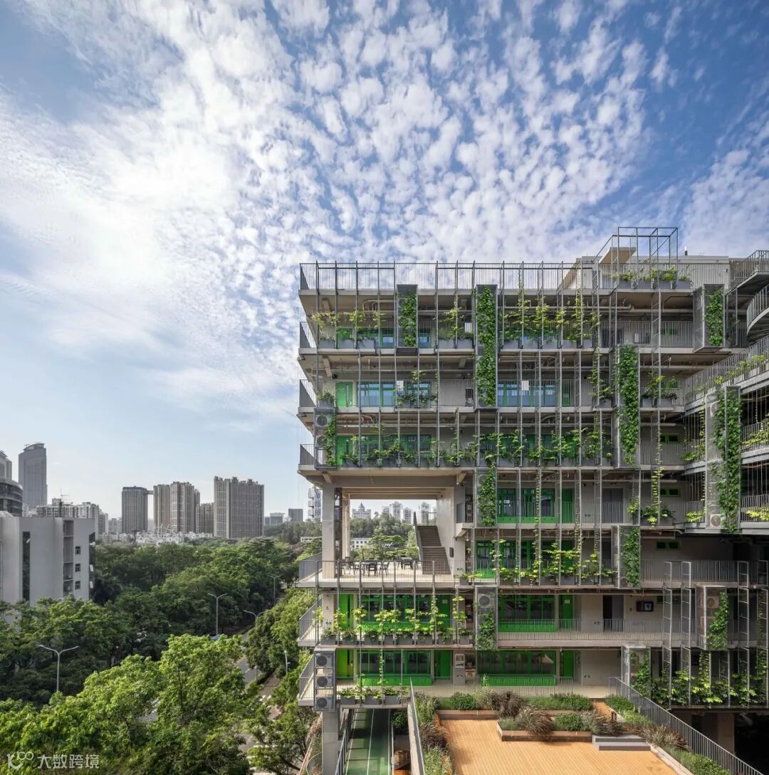 人工与自然互补,嵌入,相互依附,共同生长。教室两侧垂直绿化表皮设计形成生长在教学楼立面上的热空气滤层,并结合教学楼的双向外廊设计形成自遮阳系统,起到隔热作用的同时避免南侧炫光。