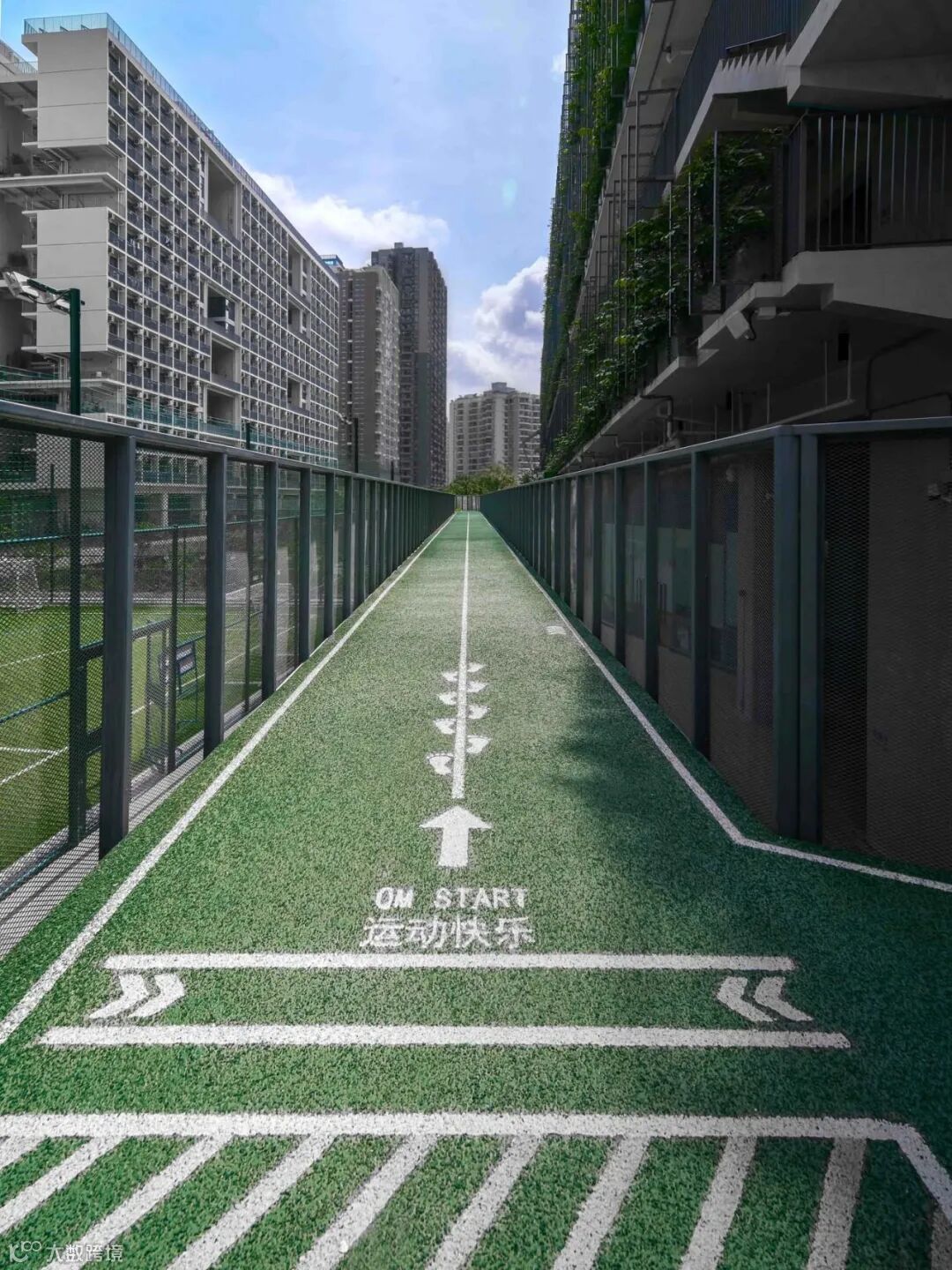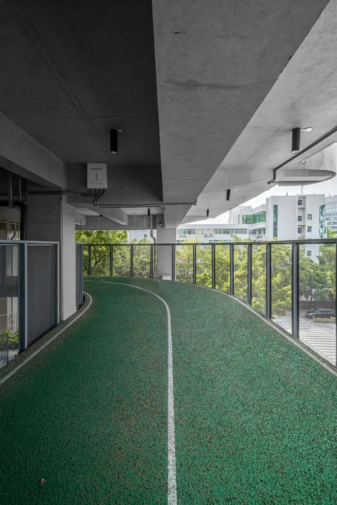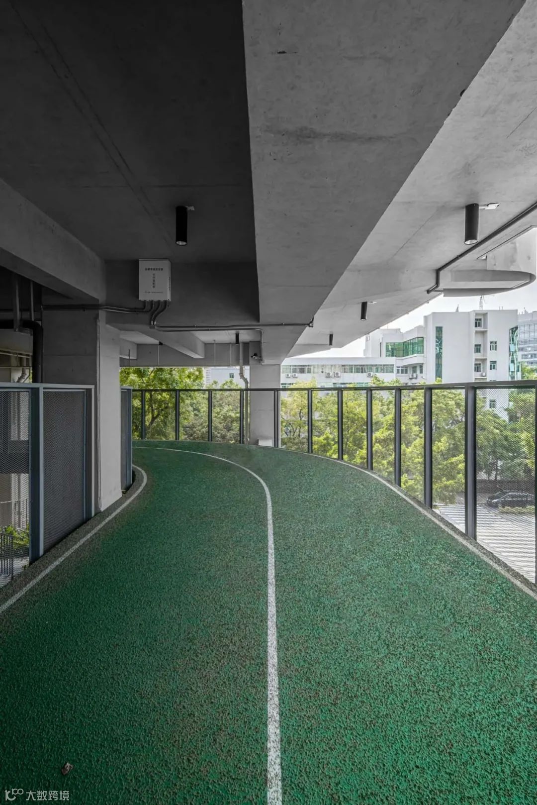 地面层与塔楼之间的虚体形成的中层空间成为建筑的“茎部”,5公里的环形跑道悬于其上,艺术教室与健身空间被设置为5个透明的异型空间,穿插在跑道两侧,成为平台空间的活动力源。不仅为校园创造了更多的室外活动场地,也是上下两种空间氛围之间的调节机制。同时,平台层也是校园内通往各个功能单元的中转站,每一个独立的交通核都是通向指定空间的端钮,结合校园标识系统和立面色彩的设计形成清晰的空间定位。