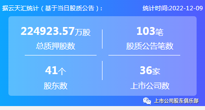 2022年12月09日,股票质押总质押股数224923.57万股,上市公司数36家,股质公告笔数103笔,股东数41个。