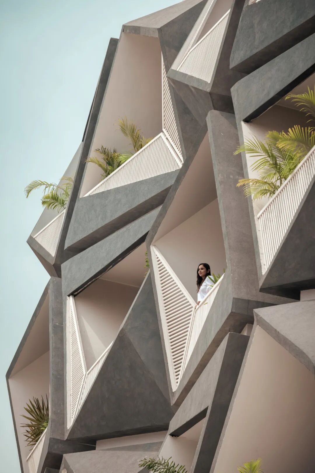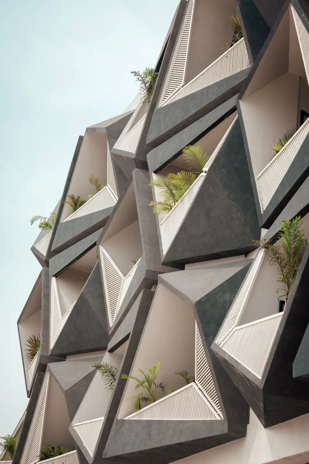 这座建筑的独特之处在于它的外墙。混凝土外墙的栏杆是象牙色的笼架,大量的氧气花盆随着微风摆动。从工作中休息两分钟,伸个懒腰,你就有了自己的私人空间喝杯咖啡,而不是长时间乏味的阳台。