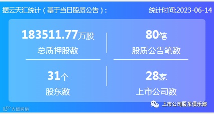 2023年6月14日,股票质押总质押股数183511.77万股,上市公司数28家,股质公告笔数80笔,股东数31个。