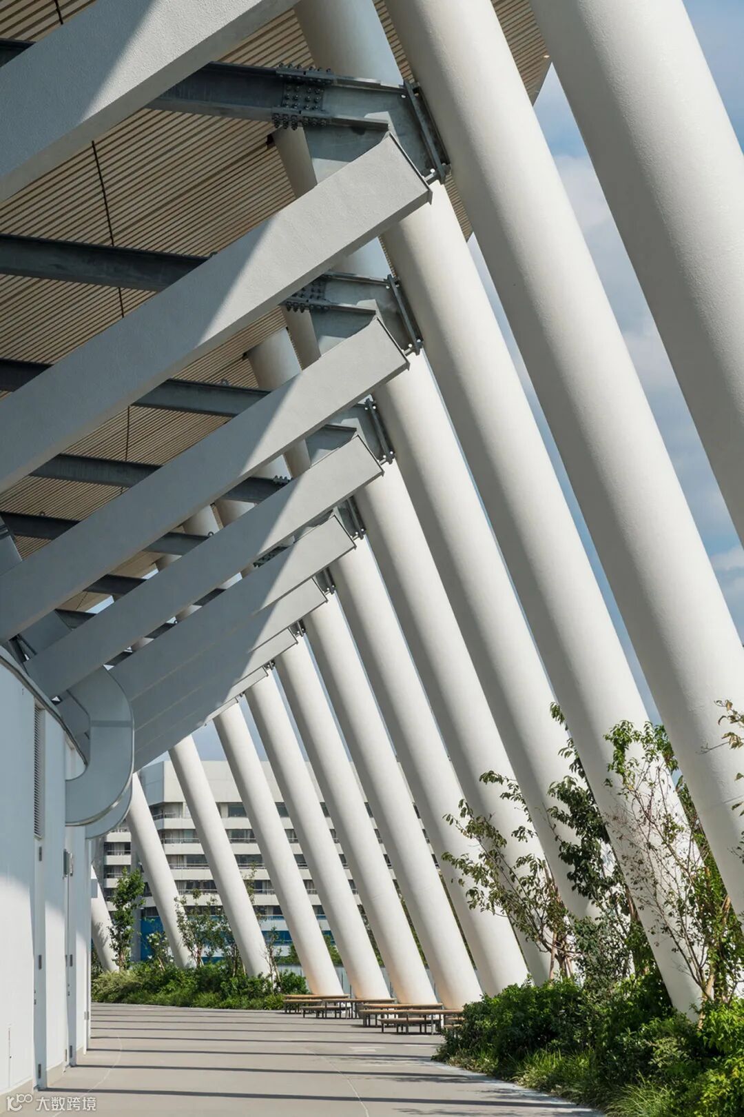 利用风改善看台的热环境——“Kaze no Obisashi(风的大屋檐)”通过有效地引入季节性风,同时通过顶部从体育场内部去除热量和湿度,改善了看台和场地的热环境。屋檐上格子之间的间距(开口率)根据建筑的方向而变化。东南偏南面较窄,以捕捉夏季的微风并将其导向看台,而北面较宽,以分流冬季的风并将其引入屋顶内部。